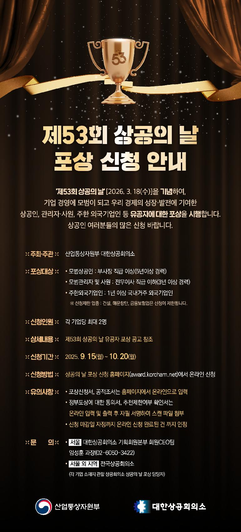 이에따라 2026년 제53회 상공의 날 포상 신청 접수가 9월 15일(월) 부터 10월 20일(월)까지 진행될 예정입니다
